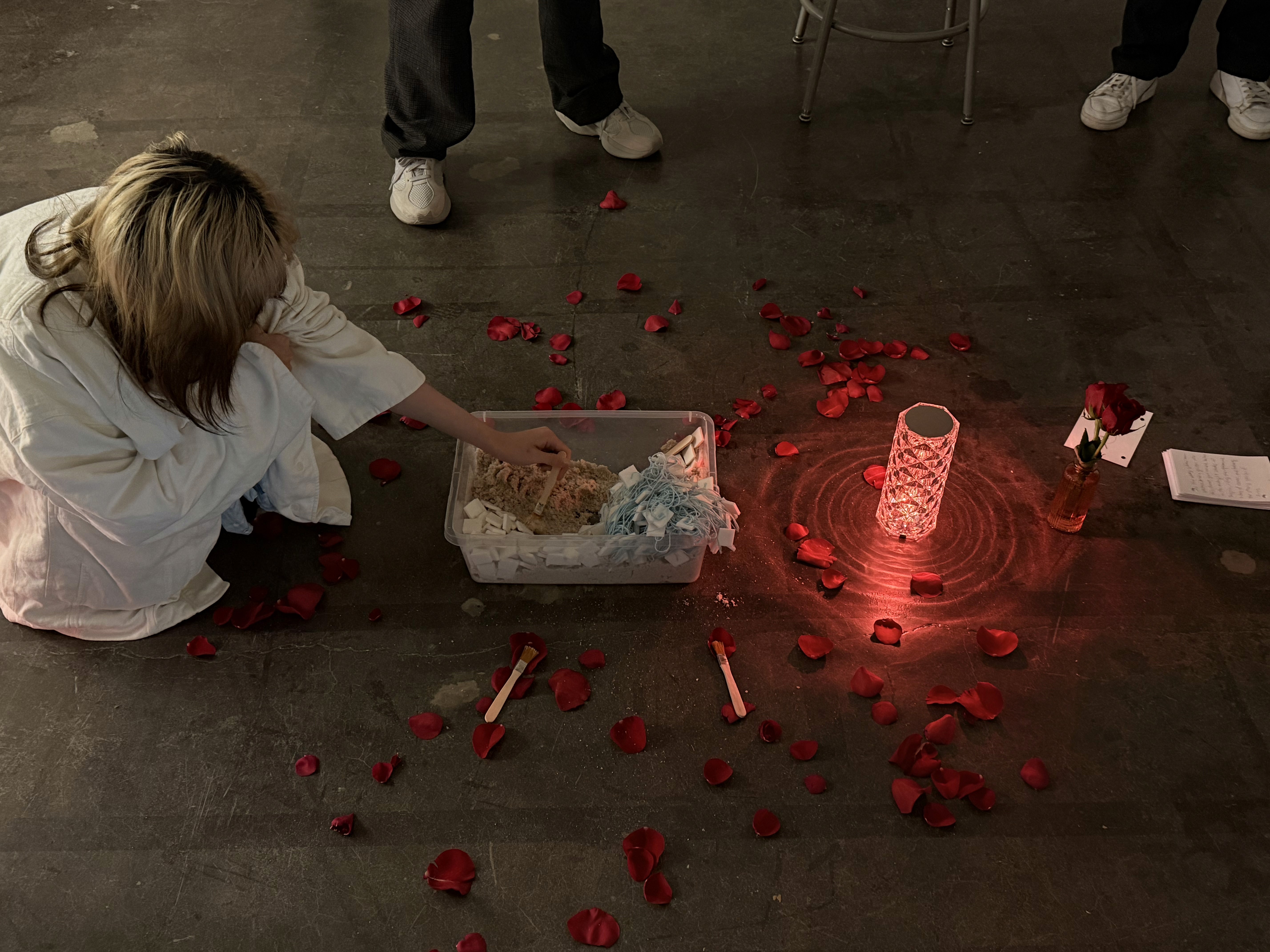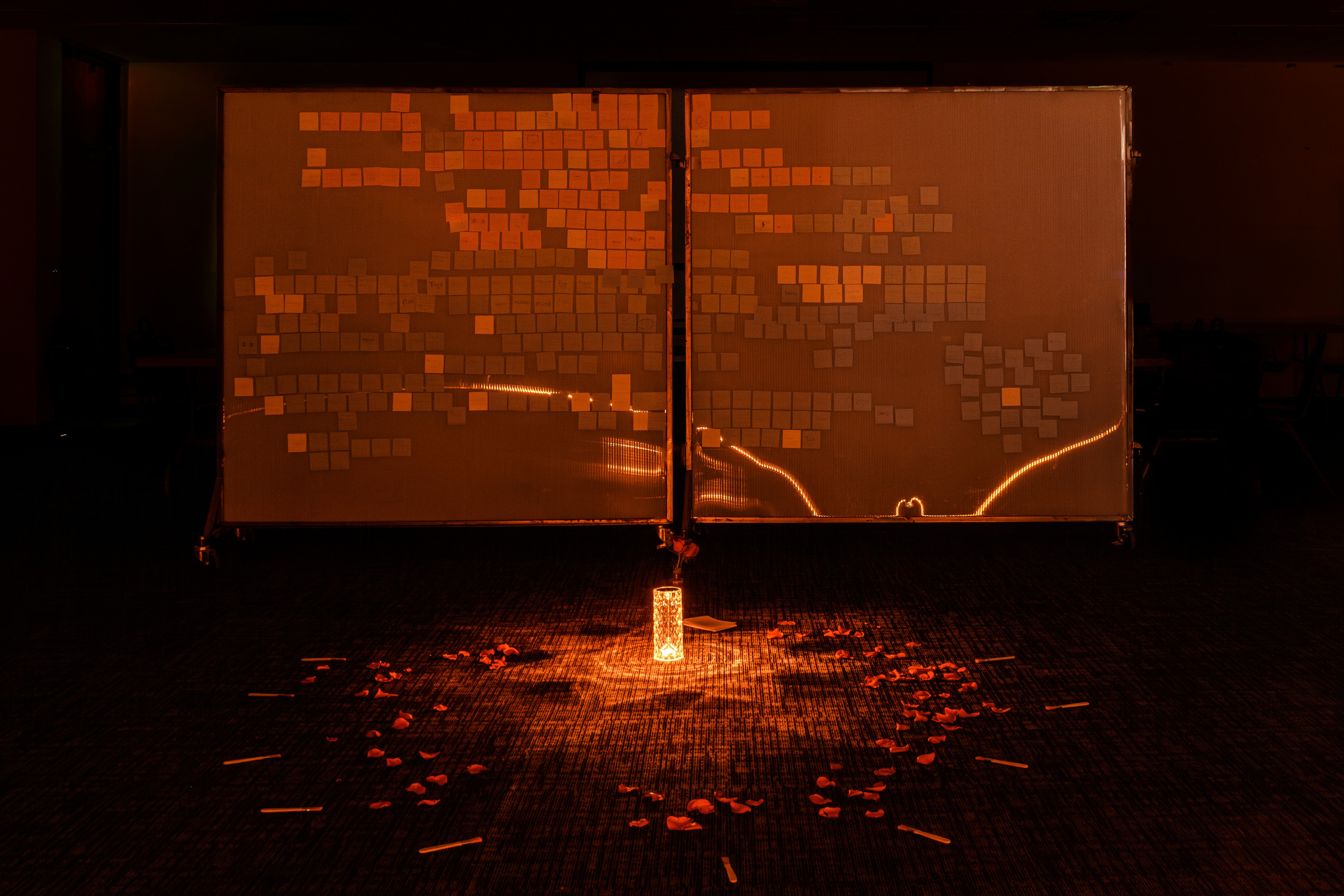 (Double) performance and mixed-media interactive environment, ink on paper, rose, ink on stickie notes, glass vase, water, foam board, yarn, superglue, sand, LED lamp, LED light strip, archaeology brushes, partition whiteboards
