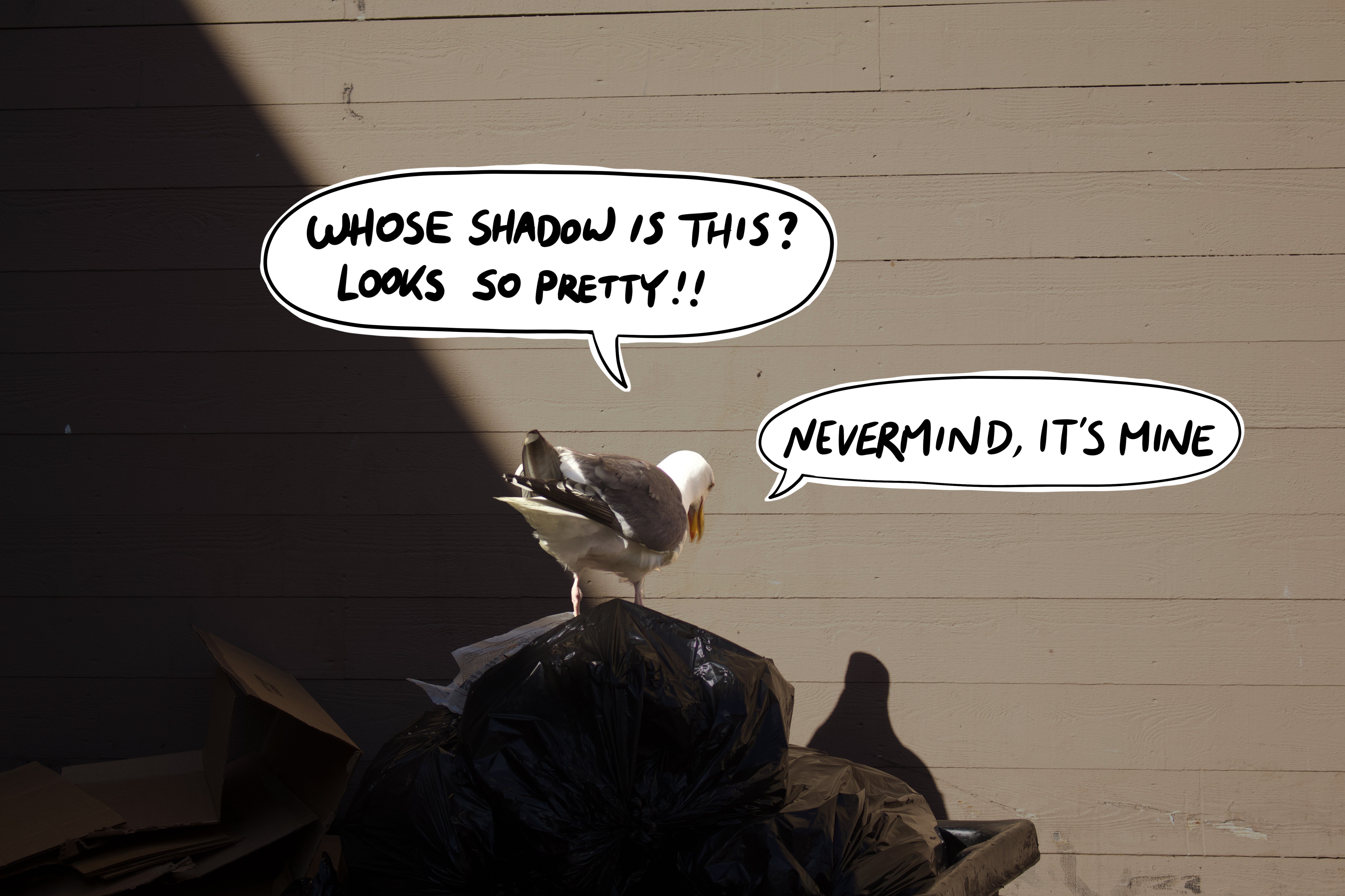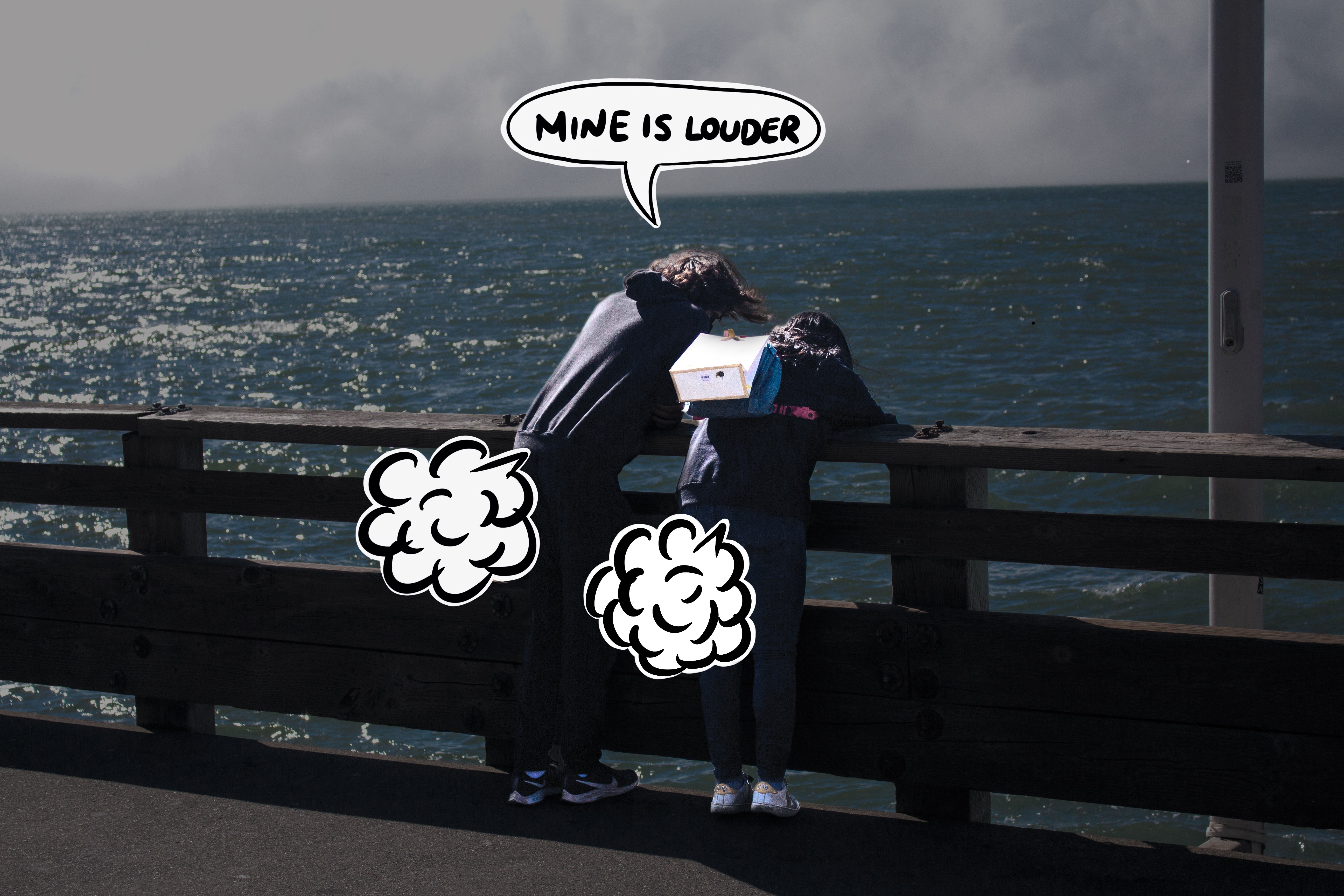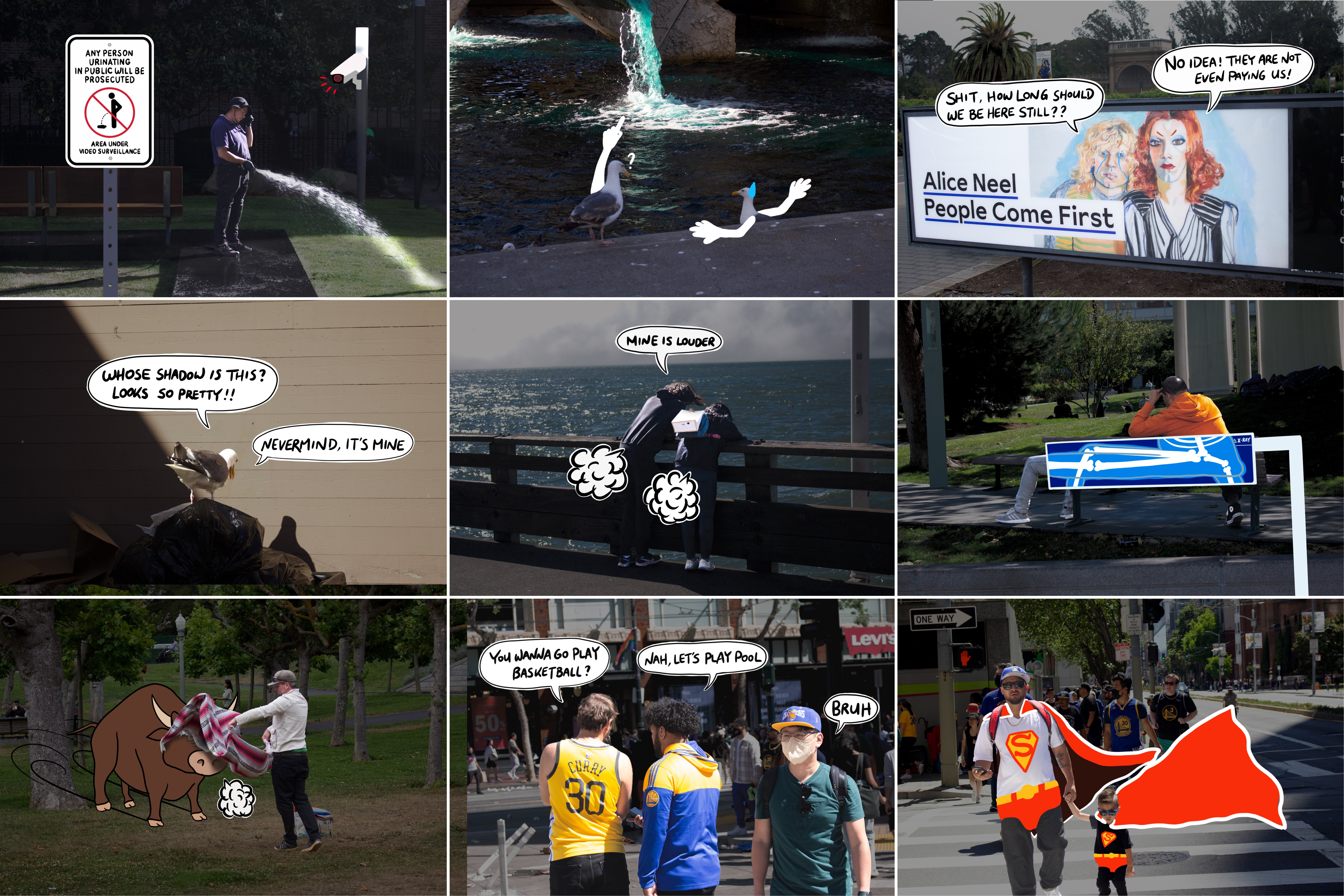 I focused on capturing moments with expressions, motion, or compositions that leave space for alternative interpretation. I tried to observe strangers, animals, or simply the landscape around me. Then I deconstructed and reinterpreted each scene while adding annotations such as conversation bubbles, “emissions,” and facial elements that clearly match each scene but at the same time are definitely not what the figures are doing or thinking right then. This method creates tension in everyday life and would induce either a quiet chuckle or a burst of relishing laughter.